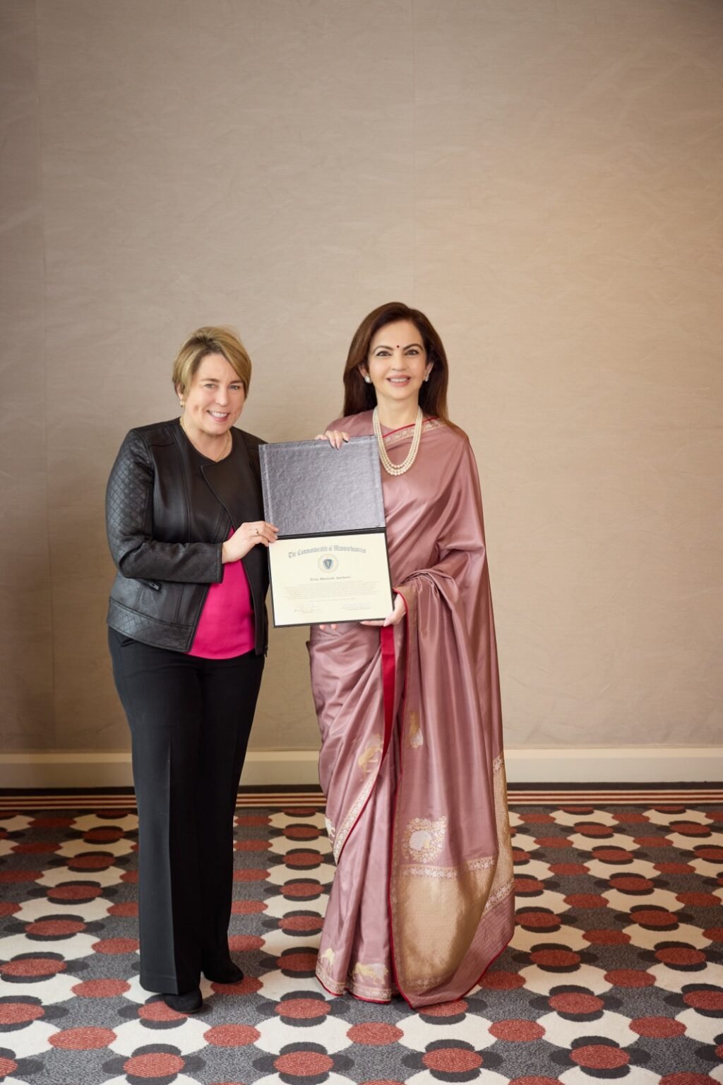 ମାସାଚୁସେଟ୍ସ: ରିଲାଏନ୍ସ ଫାଉଣ୍ଡେସନର ପ୍ରତିଷ୍ଠାତା ଅଧ୍ୟକ୍ଷା ନୀତା ଅମ୍ବାନୀଙ୍କୁ ଆମେରିକାର ମାସାଚୁସେଟ୍ସ ର ଗଭର୍ଣ୍ଣର ମୋରା ହିଲି ସମ୍ମାନିତ କରିଛନ୍ତି। ନୀତା ଅମ୍ବାନୀଙ୍କୁ ଦିଆଯାଇଥିବା ପ୍ରଶସ୍ତିପତ୍ରରେ ତାଙ୍କୁ ଜଣେ ଦୂରଦୃଷ୍ଟି ସମ୍ପନ୍ନ ଏବଂ ପରୋପକାରୀ ବ୍ୟକ୍ତିତ୍ୱ ଭାବରେ ମାନ୍ୟତା ଦିଆଯାଇଛି। ବୋଷ୍ଟନରେ ଏକ ସ୍ୱତନ୍ତ୍ର ସମାରୋହରେ ନୀତା ଅମ୍ବାନୀଙ୍କୁ ଏହି ସମ୍ମାନ ପ୍ରଦାନ କରାଯାଇଛି।